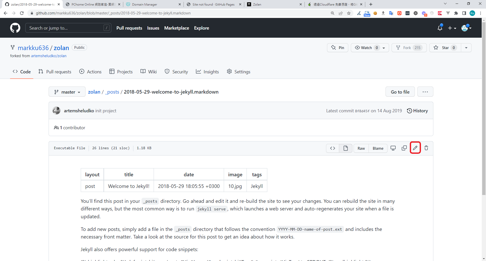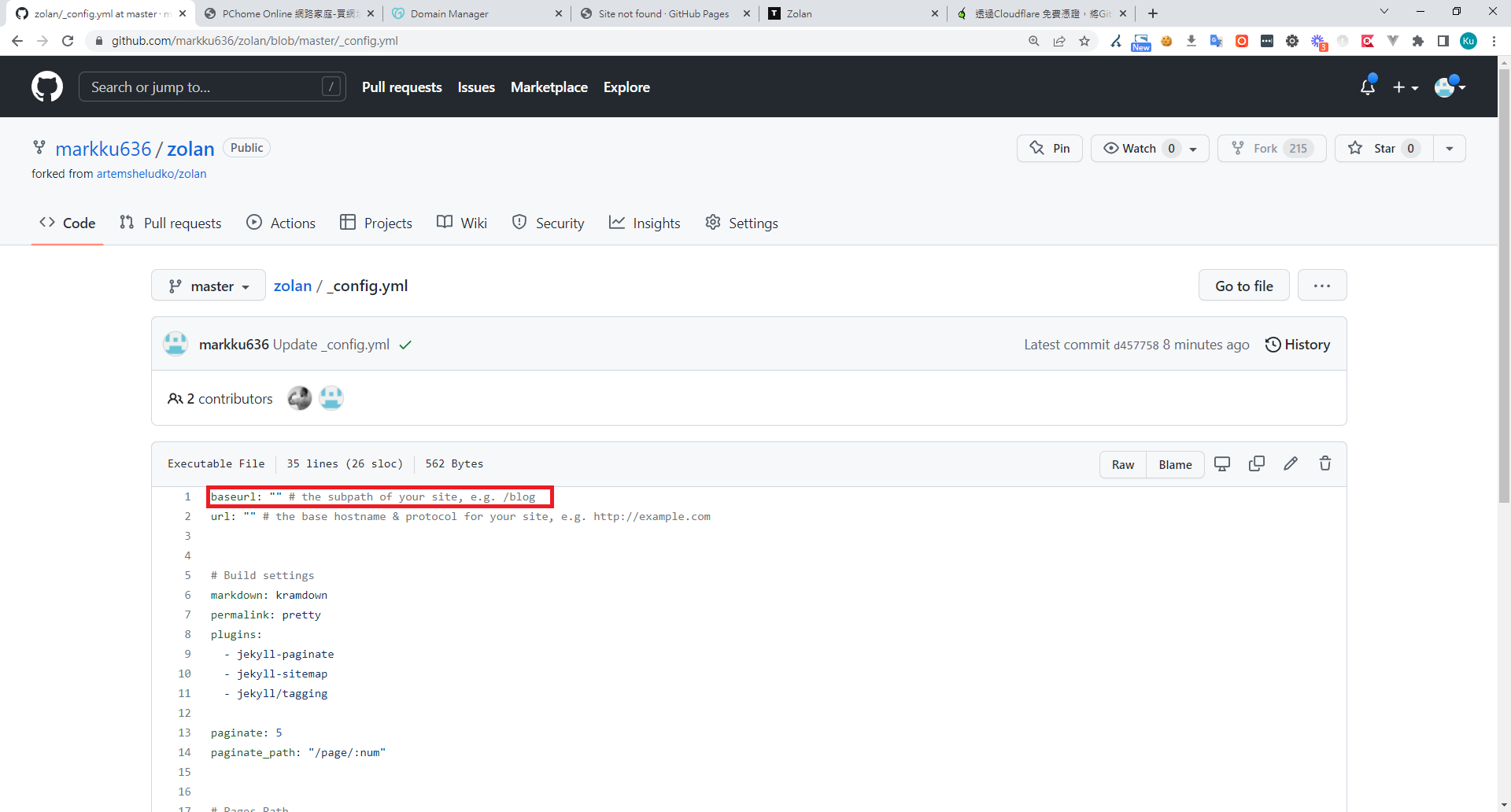 8. 編輯專案下的 _config.yml,將 baseurl 清空 > Commit changes