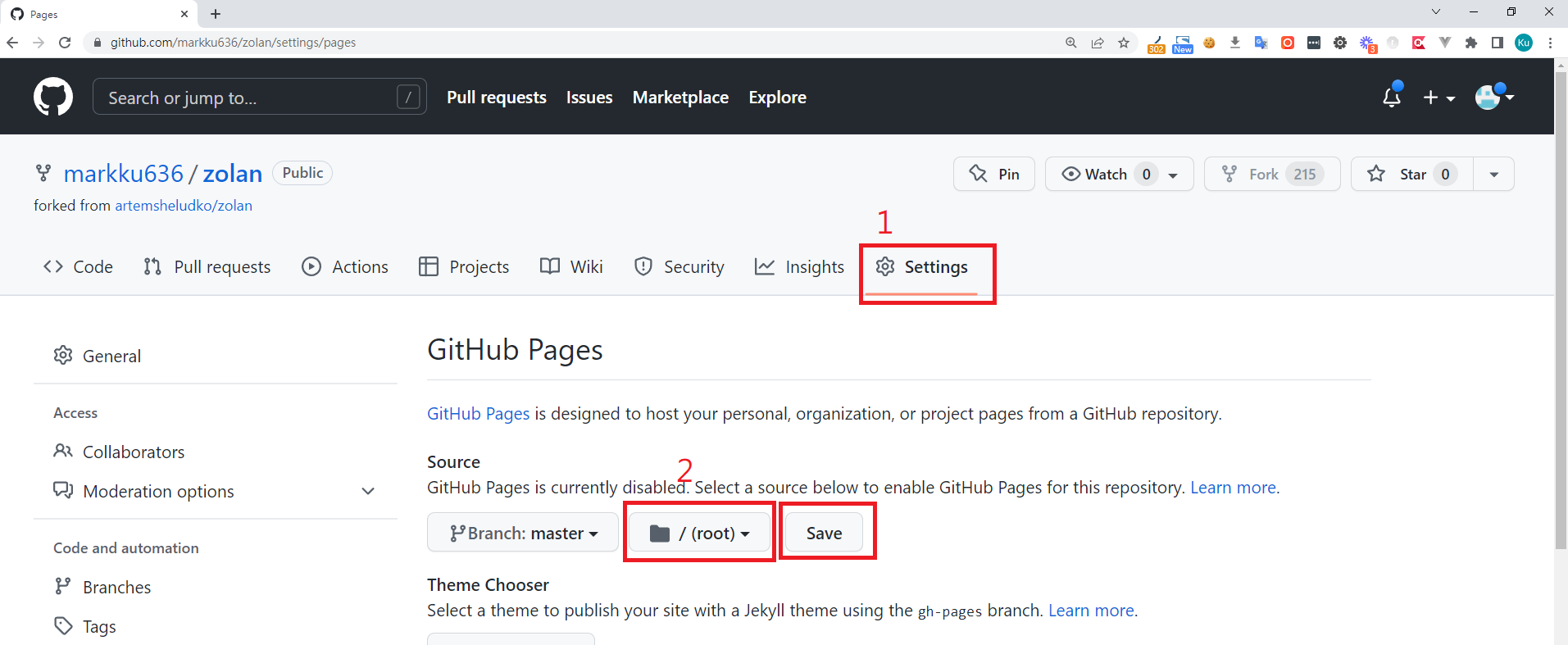 3. fork 完成,接著我們要設定 Github Pages,Settings > Pages > Source > Root > Save
