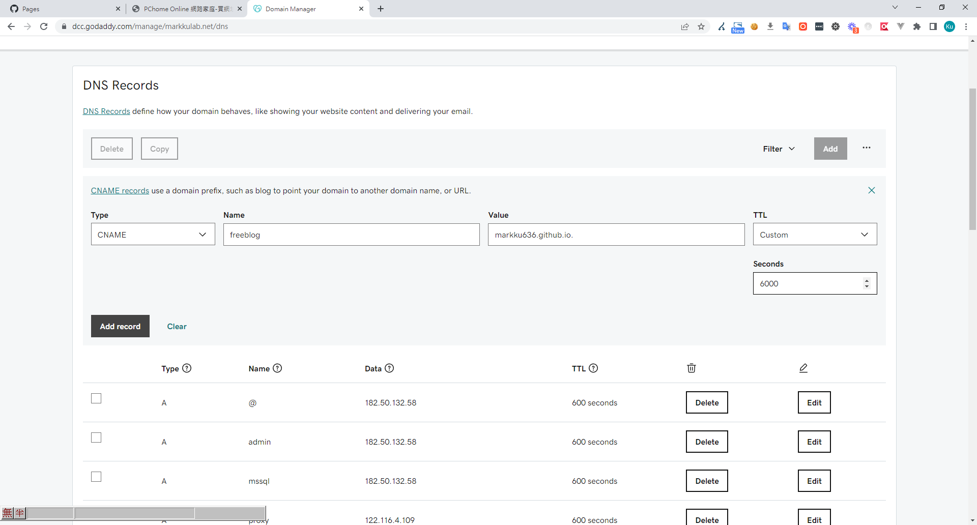 7. 至 DNS 將域名,新增一筆 CNAME 記錄,指向 Github 指定的 Url