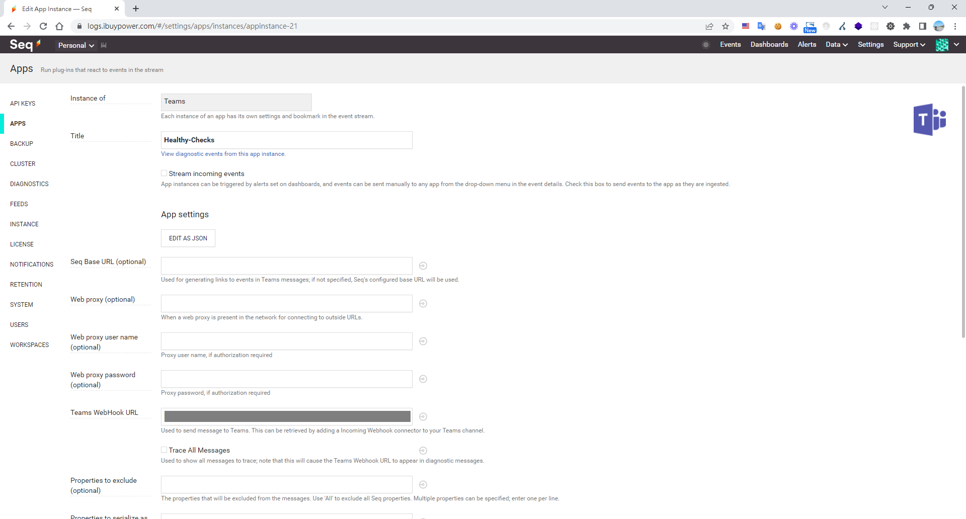 在APPS 的 Package 欄位輸入 "Seq.App.Teams"